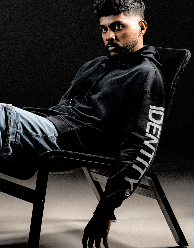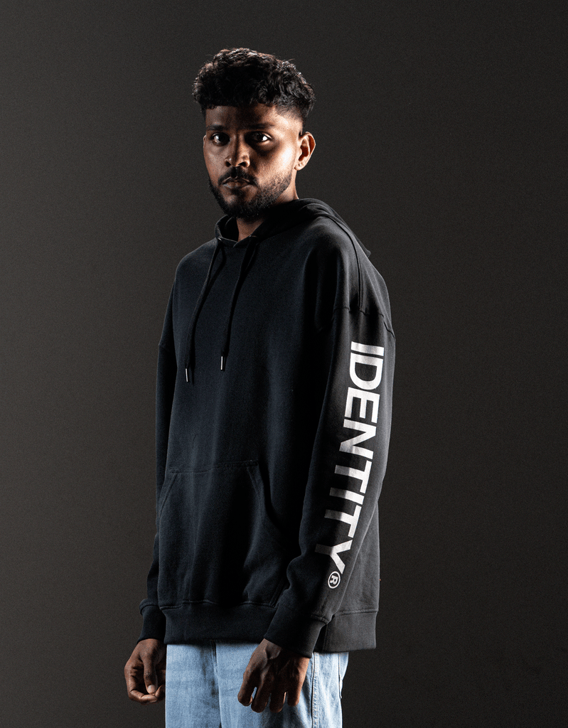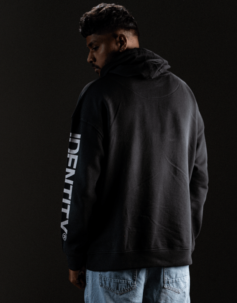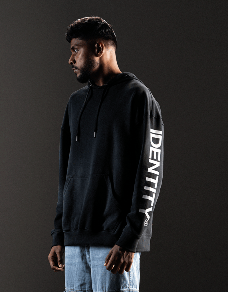 Clean silhouette. Loud shoulders. The Identity Sleeve Print Hoodie keeps it sleek with a jet black base, but brings fire with its spray-on effect detail across the shoulders—like smoke rising from something about to erupt.