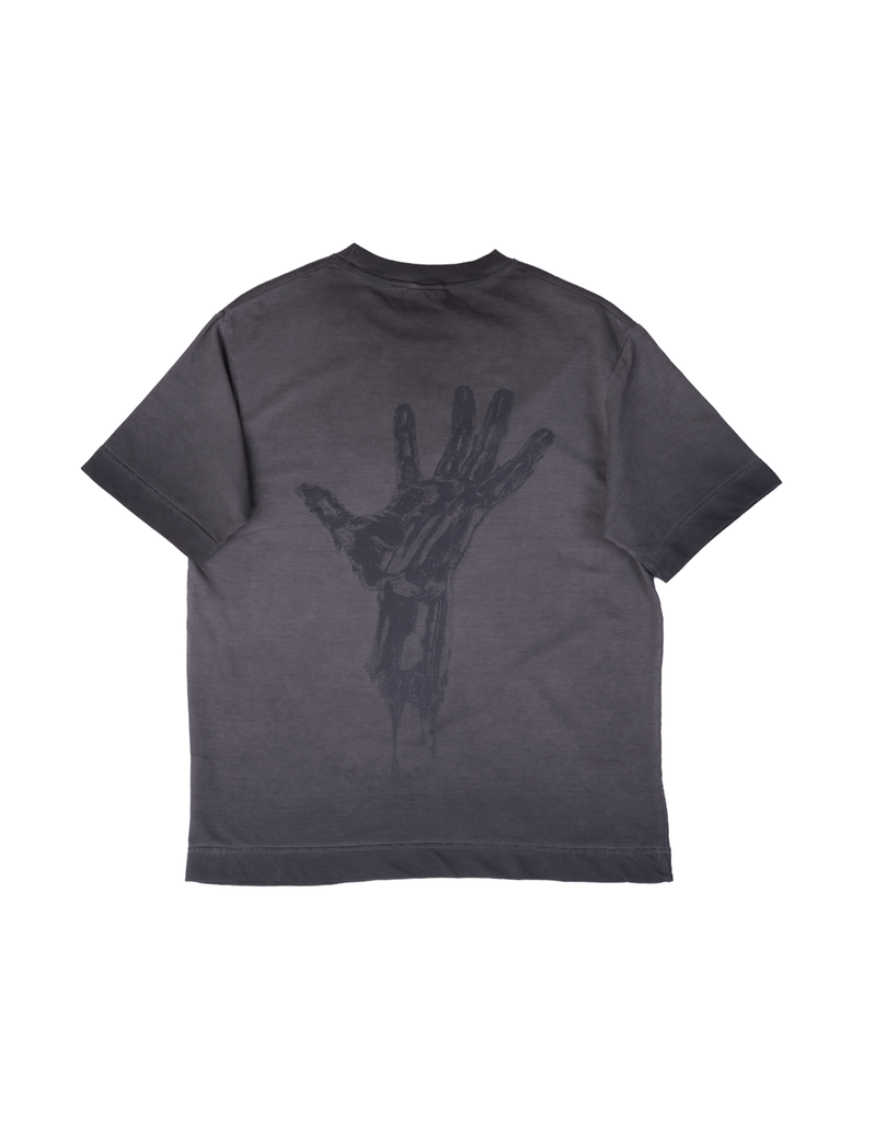 The skeletal hand symbolizes mortality, struggle, and raw truth. At the same time, an open hand can represent reaching out, offering, or connection. Paired with the distressed black look, the shirt conveys mystery, rebellion, and underground street culture.