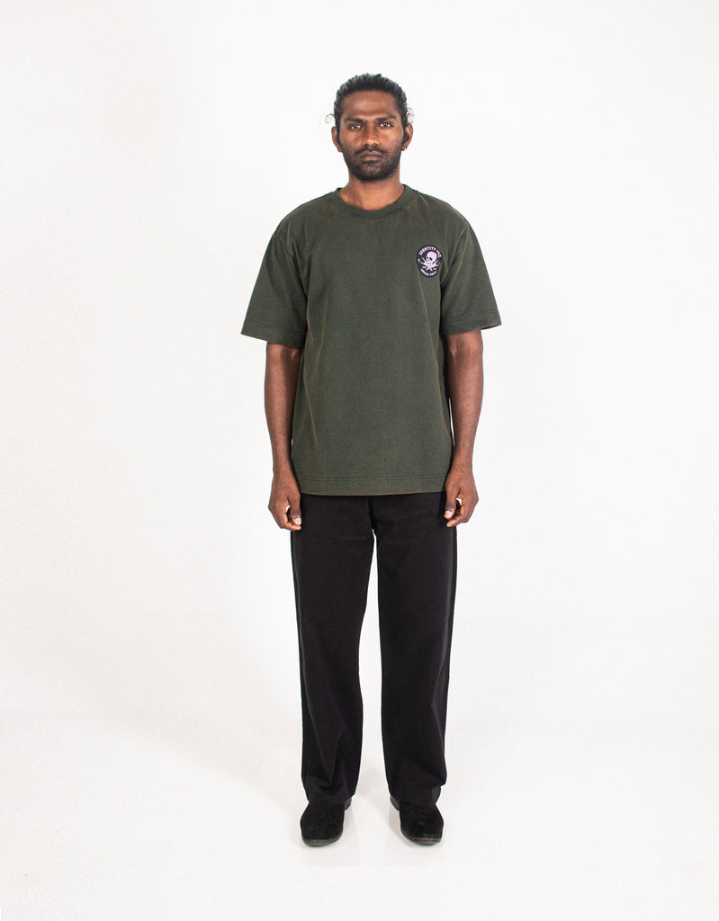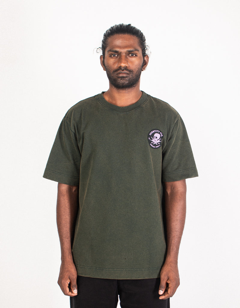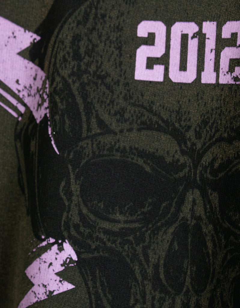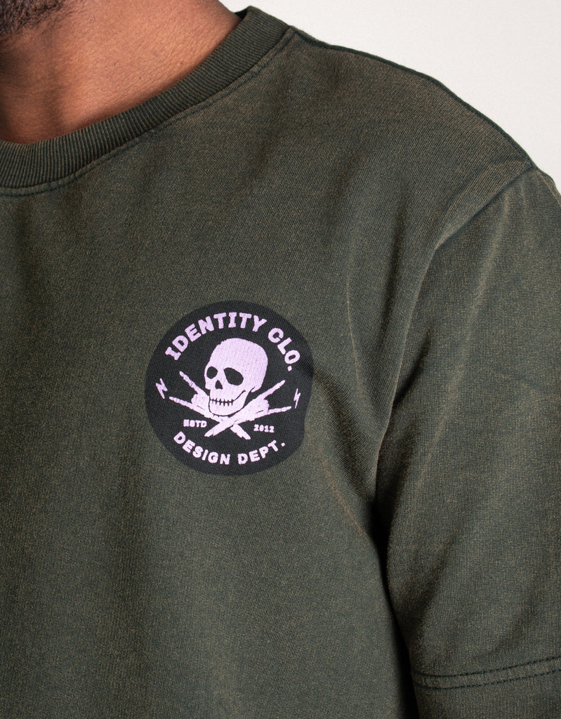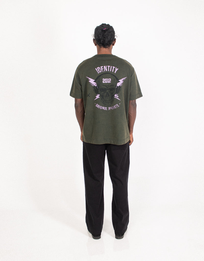 This t-shirt showcases a striking design featuring a skull wearing headphones, symbolizing rebellion, individuality, and a deep connection to music culture. The word "IDENTITY" at the top emphasizes self-expression, while "2012" likely marks the brand's origin or a significant moment in its history. Beneath the skull, the phrase "ORIGINAL APPAREL" reinforces themes of authenticity and uniqueness. The lightning bolts on each side of the skull add a bold, energetic element, reminiscent of rock or underground styles. Printed in distressed purple on a dark green base, the design has a vintage, grunge-inspired look that fits well within the edgy, urban streetwear aesthetic often embraced by independent or Tamil fashion brands.