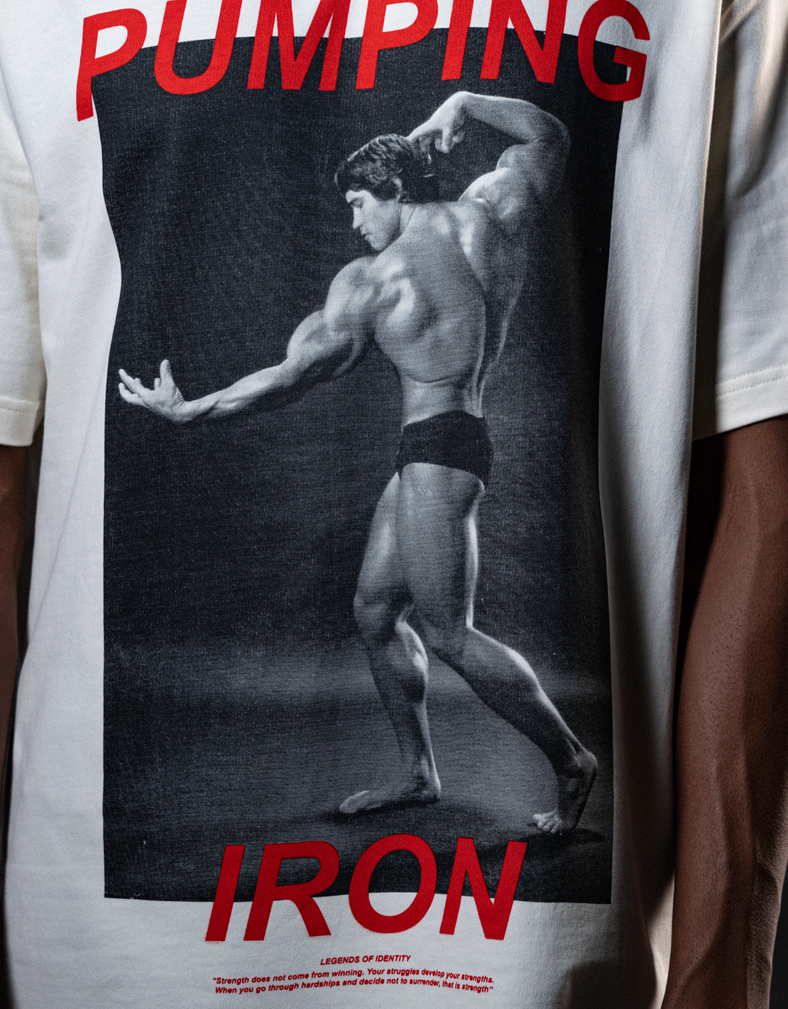 The person on the T-shirt is Arnold Schwarzenegger, the legendary Austrian bodybuilder, actor, and former Governor of California. The text “Pumping Iron” refers to the famous 1977 documentary film about bodybuilding, where Arnold played a central role. This movie not only showcased his dominance in bodybuilding competitions but also made him a global icon, eventually leading to his acting career (The Terminator being his most famous role).