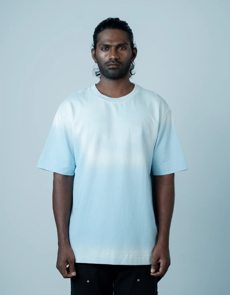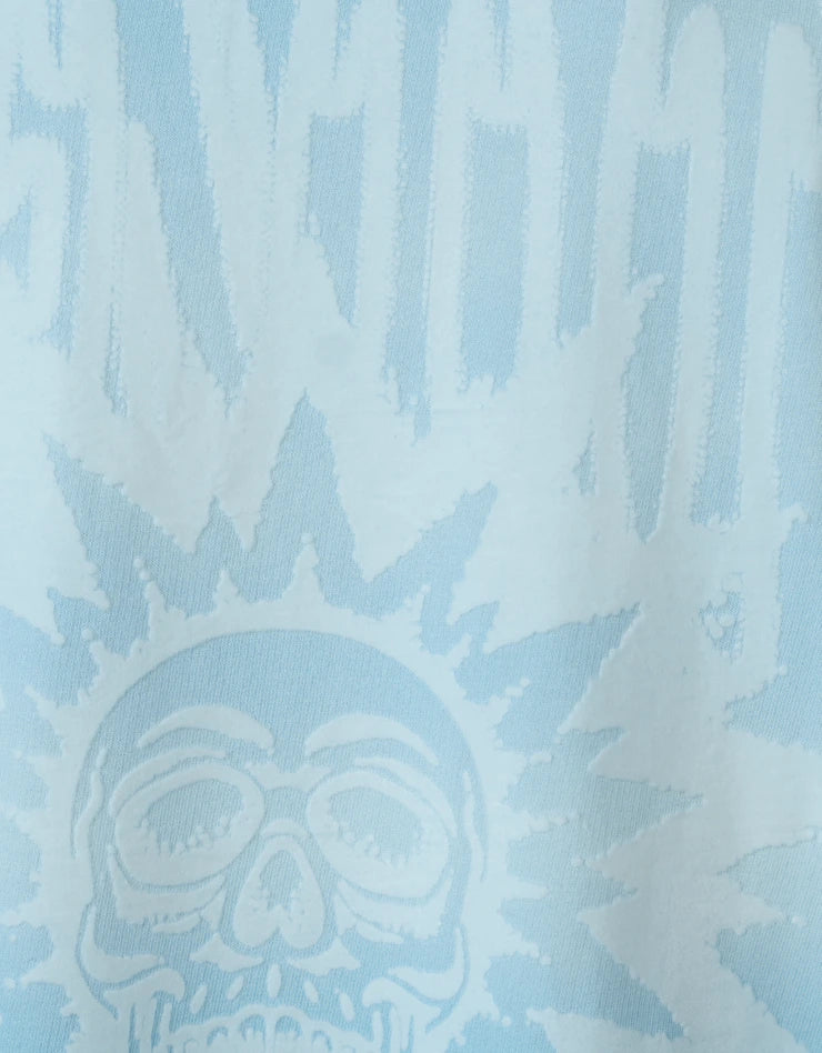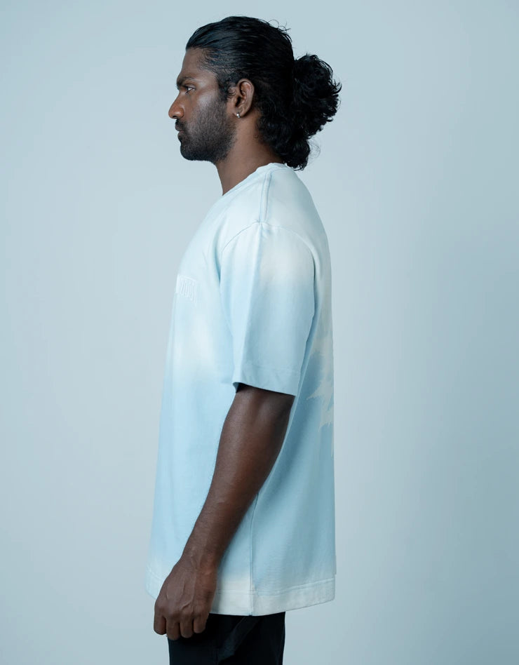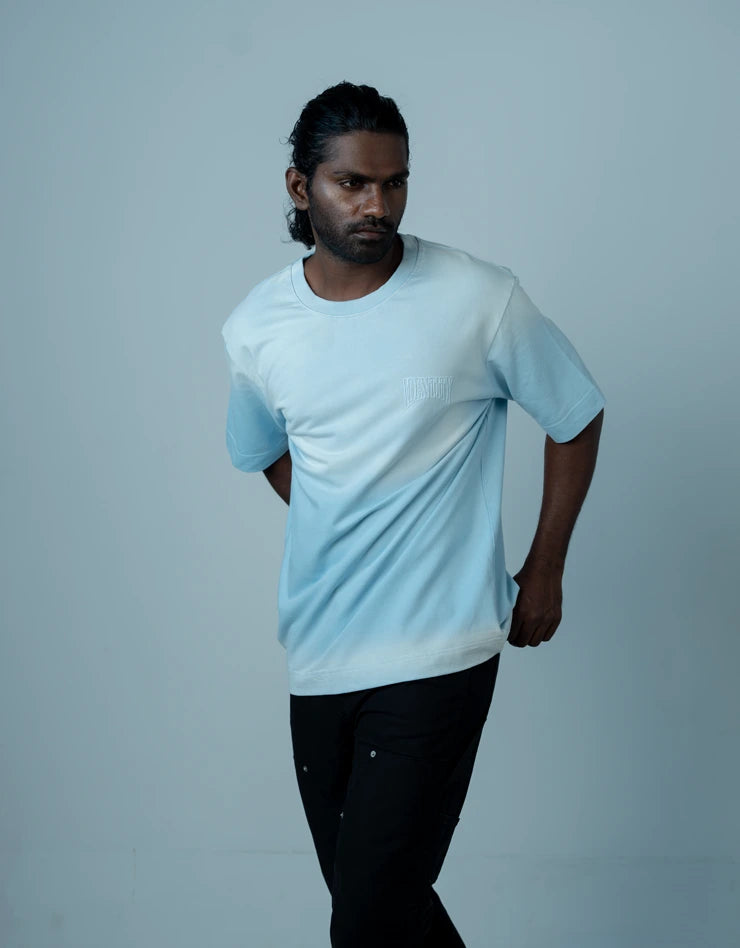 The design features a skull at the center, symbolizing mortality, truth, and fearlessness in facing life’s raw realities. Surrounding it is a sunburst, representing enlightenment and the powerful energy of inner awakening—suggesting that identity comes from within. The bold word “IDENTITY” highlights the theme of self-discovery and authenticity. The soft washed-out blue and white tones add a calm yet edgy aesthetic, blending gentleness with rebellious spirit.