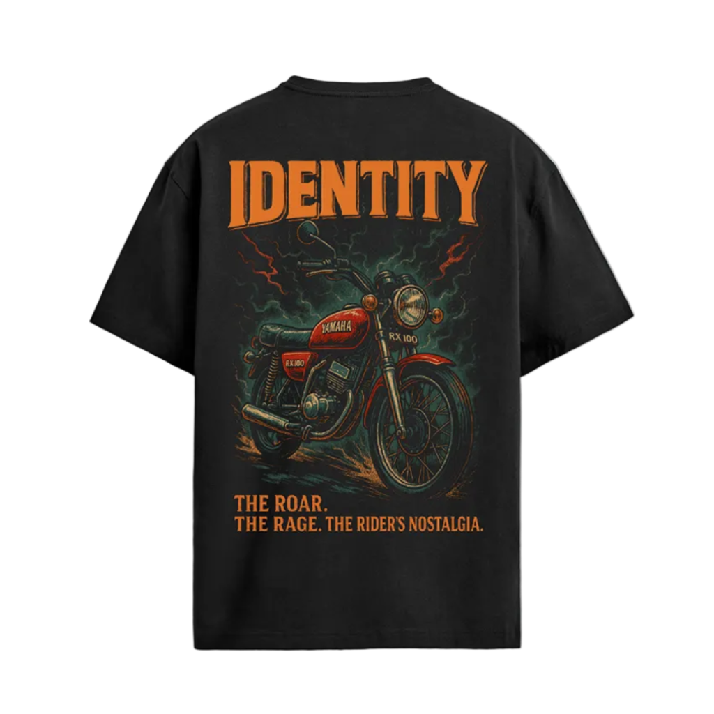 The t-shirt represents rider identity and nostalgia, centered around the legendary Yamaha RX100 motorcycle. It speaks to people who connect emotionally with biking culture especially those who grew up admiring or riding this iconic machine.